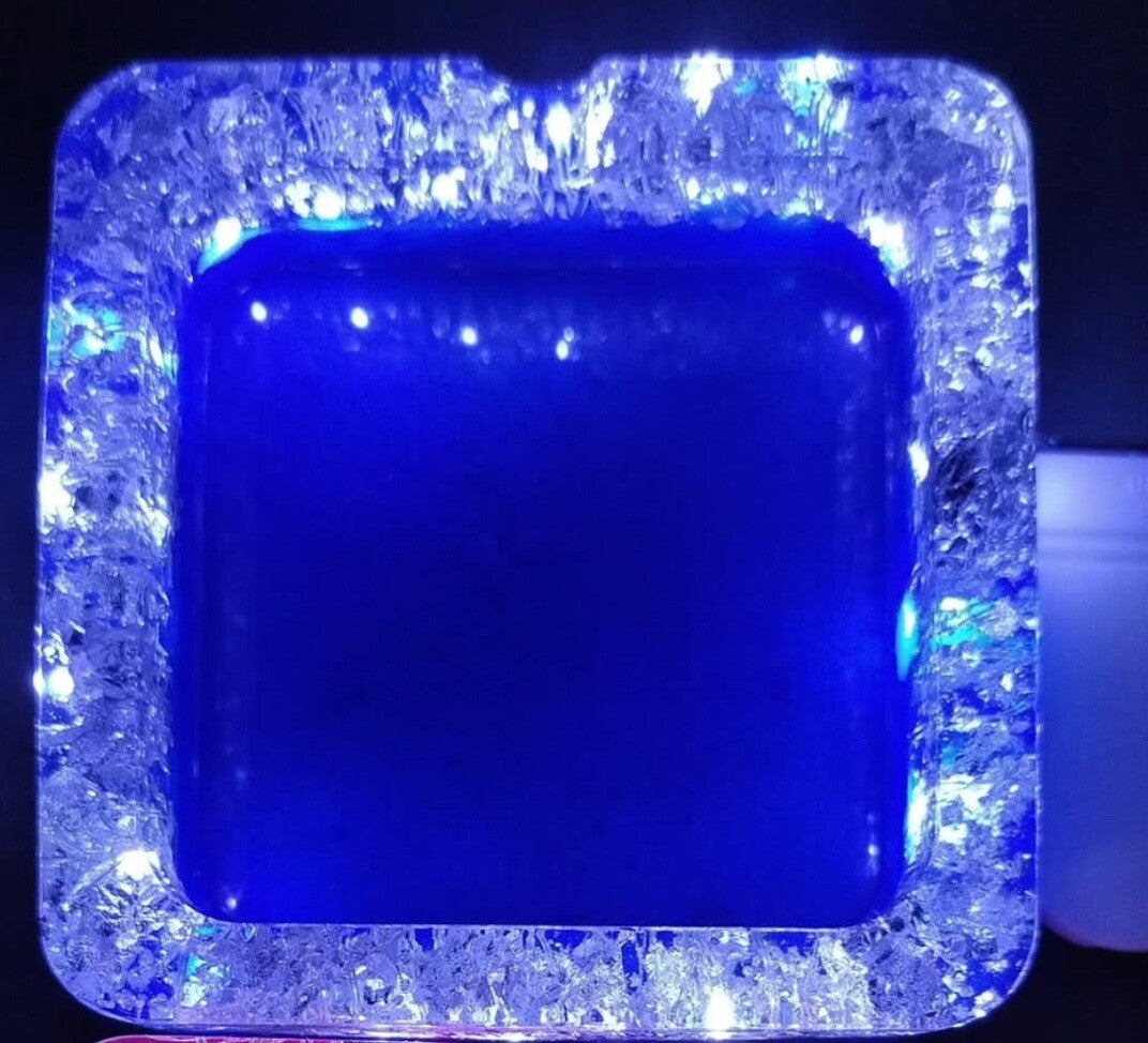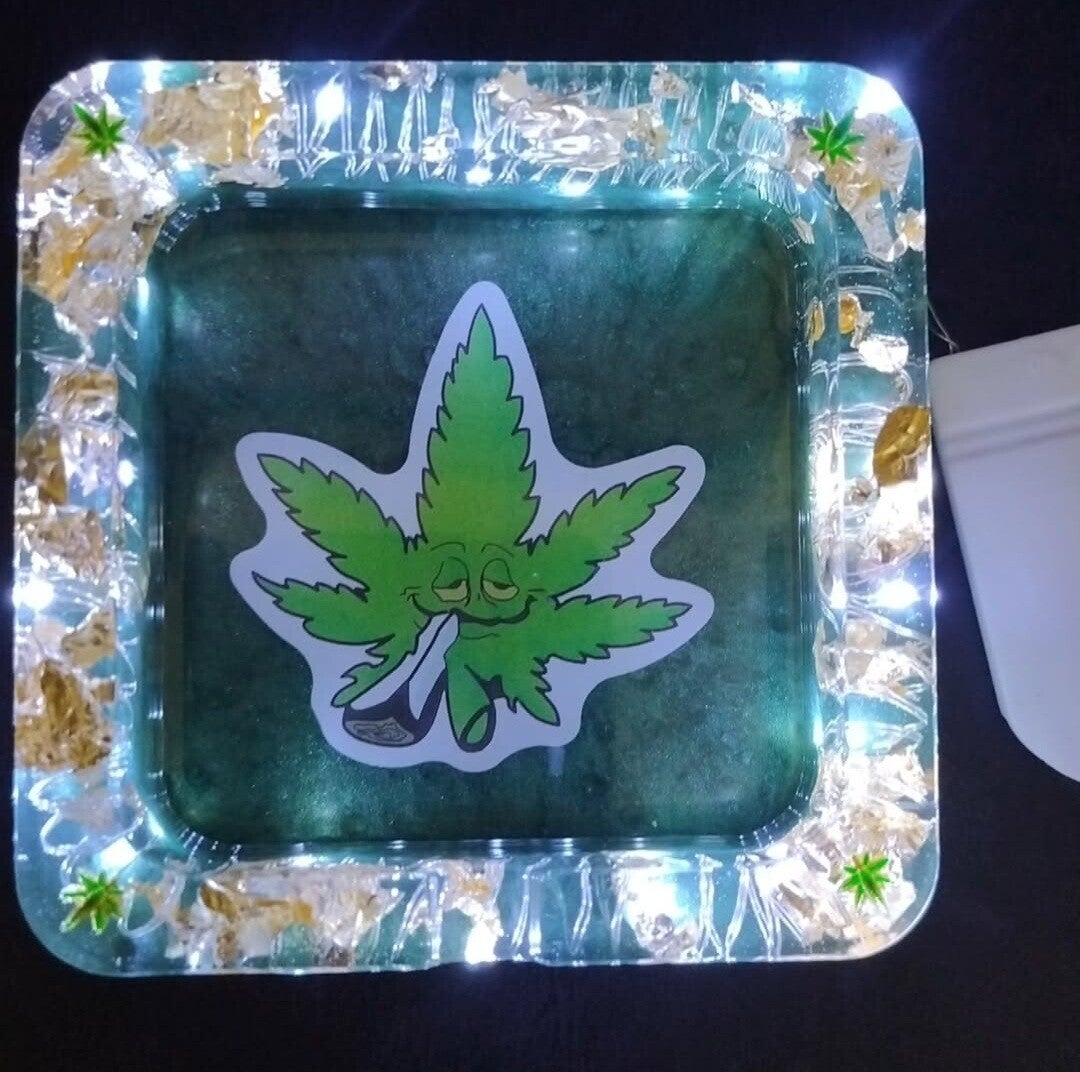 These ashtrays are made with epoxy resin. The ashtrays light up and I can customize to your liking with your choice of color, flakes and a photo.