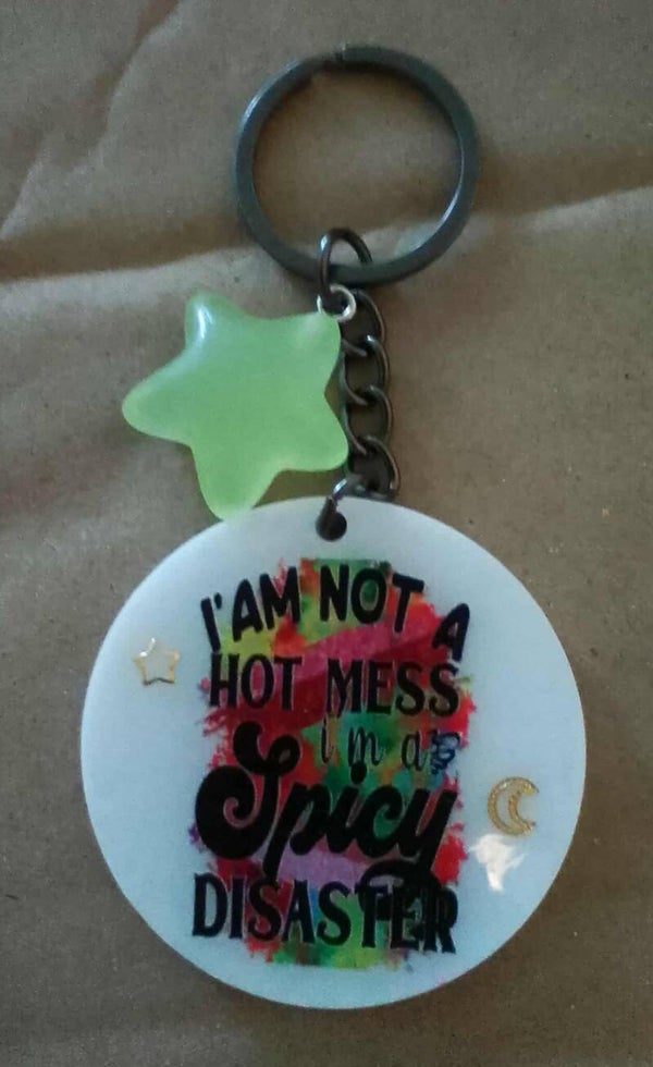 These small Keychains are made with epoxy resin. The star charm glows in the dark and is also made with epoxy. The length is approximately 3 inches. These keychains include a sassy or an inspirational quote to brighten your mood daily.