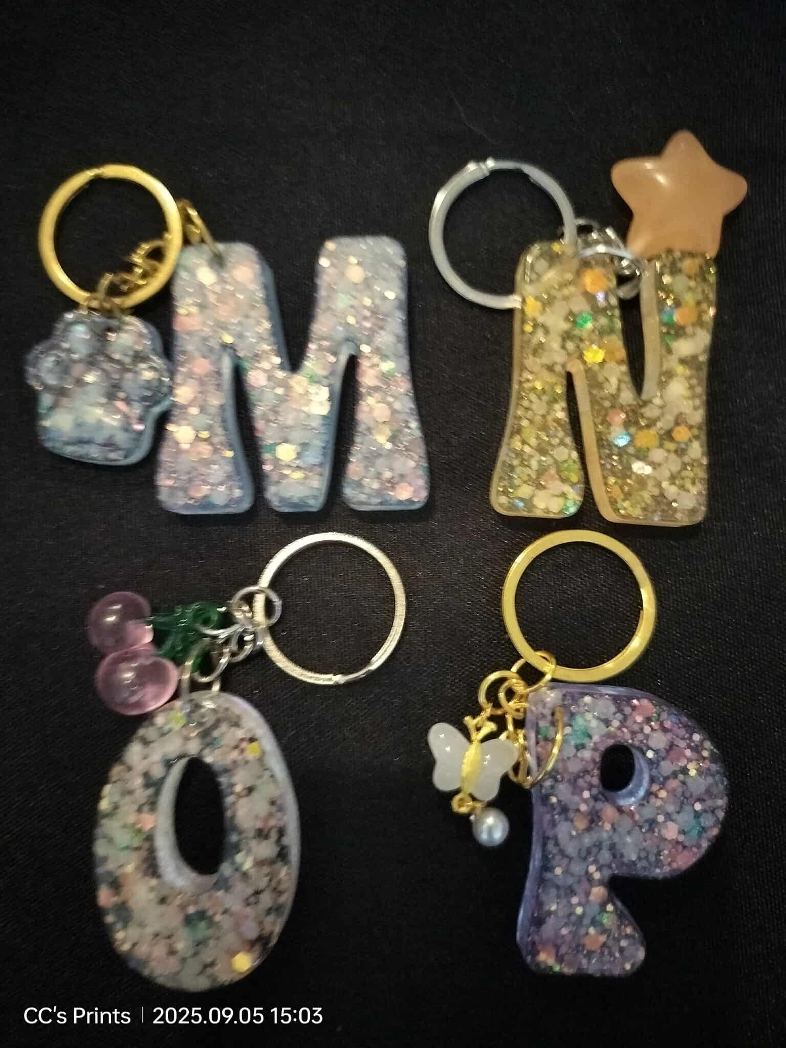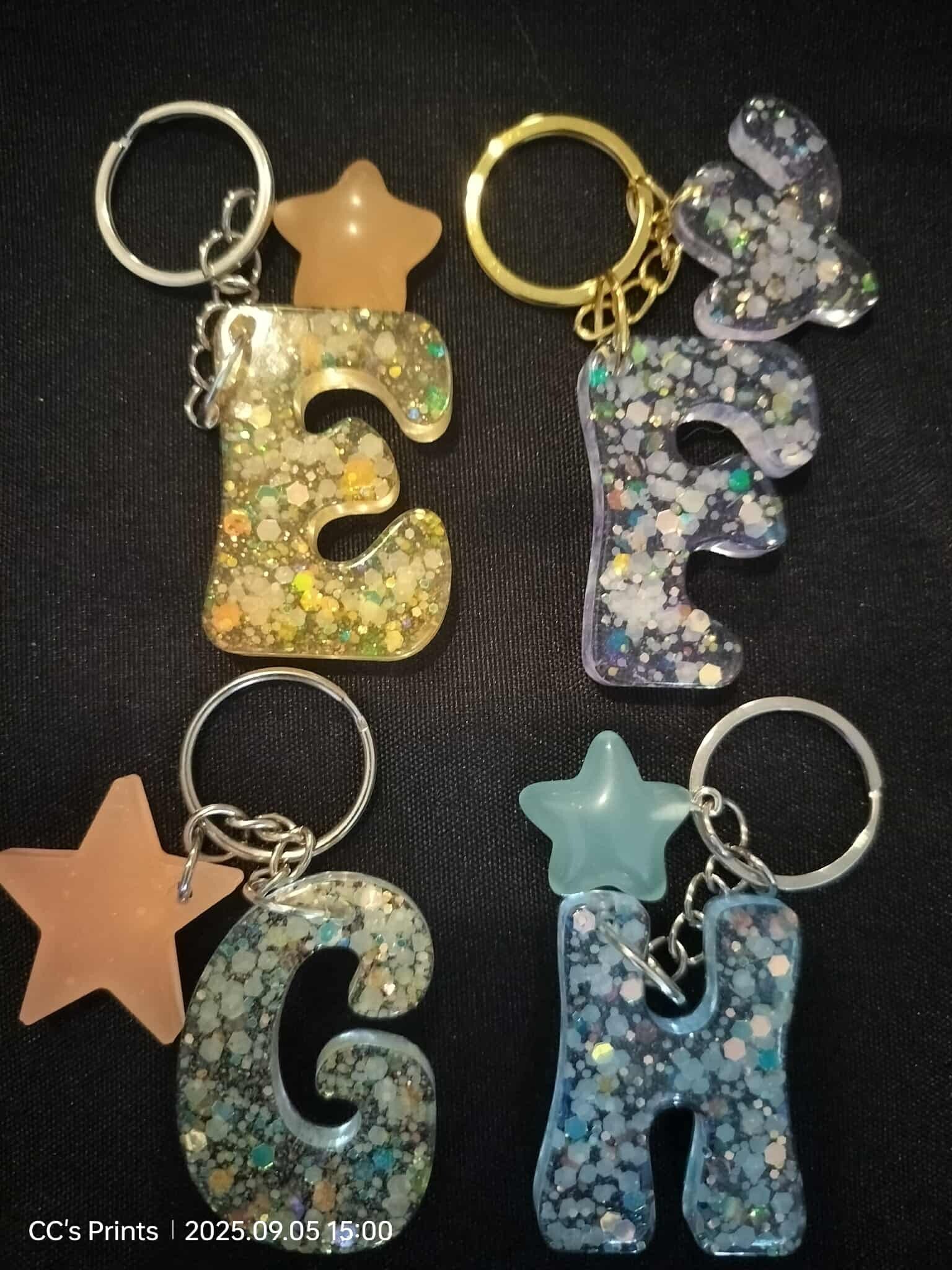 These letter keychains are made with epoxy resin with glow in the dark glitter. It also includes a charm of your choice. Use UV light to activate the glow (Sun or UV light).