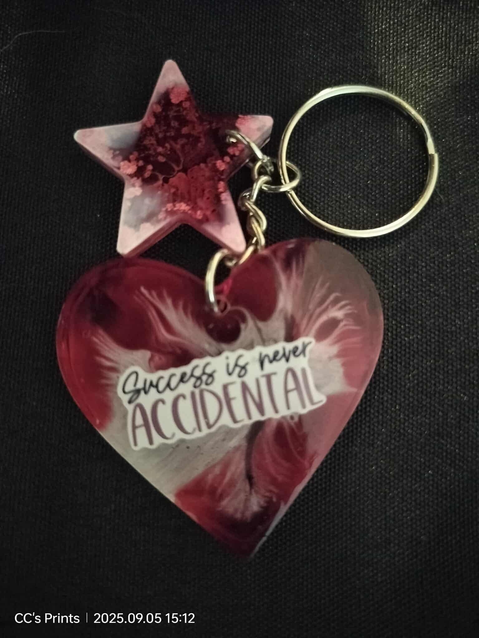 These keychains are made with epoxy resin. They include an inspirational quote as well as a charm. Approximately 3 inches long.