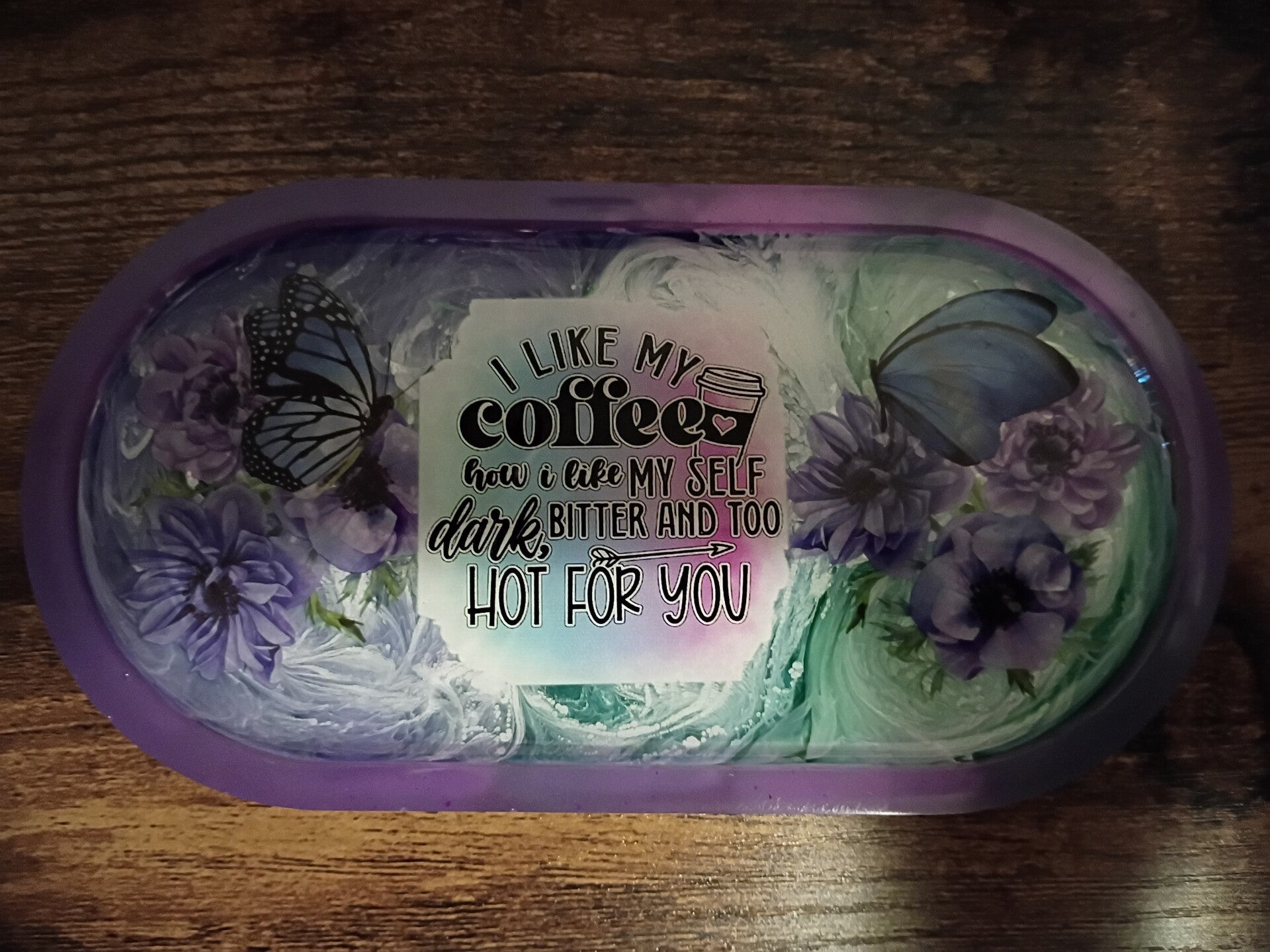 This glowing Trinket Tray has a sassy quote "I like my coffee how I like myself, dark, bitter and too hot for you". This tray is made with Epoxy Resin.