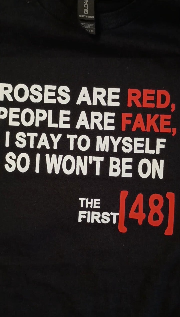 This black T-shirt comes in a size extra large (XL). The quote says "Roses are red, people are fake, I stay to myself so I won't be on the first 48".